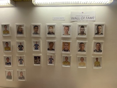 Utanför instruktörernas arbetsrum passerar man ”Wall of Fame”. Här finns bilder på tidigare elever som elitdebuterat som exempelvis: